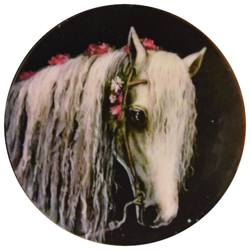 Maalauksista käsinvalmistetut pyöreät magneettikoristeet vaikkapa jääkaapinoveen. Magneetti on pieni ja kevyt puukiekko (halkaisija 4cm ja paino 5g), jonka taakse on liimattu magneettinauhaa. Kaikki magneetit on pintakäsitelty akryylilakalla. Kuvassa on realistisesti ja muotokuvan omaisesti maalattu vaalean harmaa hevosenpää. Tausta on musta, joten heppa suorastaan loistaa kuvasta. Kaunis hevonen, yllään valjaat, sekä muutamia ihastuttavia vaaleanpunaisia kukkasia pitkin laineikasta valkoista harjaa. Silmistä paistaa lempeys ja rohkeus. Jokaiselle heppatytölle sopiva!