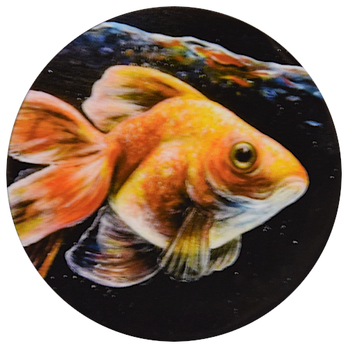 Pyöreä magneetti, jossa hyvin realistisesti maalattu kultakala ui vedenpinnan tuntumassa.