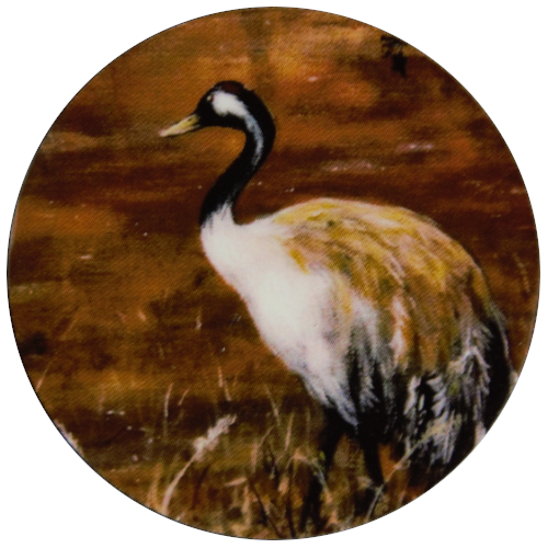 Maalauksista käsinvalmistetut pyöreät magneettikoristeet vaikkapa jääkaapinoveen. Magneetti on pieni ja kevyt puukiekko (halkaisija 4cm ja paino 5g), jonka taakse on liimattu magneettinauhaa. Kaikki magneetit on pintakäsitelty akryylilakalla. Kuvassa on ruskean eri sävyinen vedenpinta. Pinta on tyyni, vain pientä veden värähtelyä. Heijastuksissa näkyy hieman tummia kuusipuita taustan yläreunassa. Magneetin keskellä seisoo ylväs kurki, sivusta päin kuvattuna, vasemmalle tarkaavaisesti katsoen. Kurjella on pitkä kaareva kaula, oranssi litteä nokka, sekä iso pöyheä sulkien peittämä vartalo, pitkien ohuiden koipien kera. Kurjen kaula ja pää ovat mustat, poskessa valkoinen raita. Selkäsulat ovat vaaleanruskean eri sävyissä, mahanpuolelta tasaisen valkoinen. Kuva on hieman taianomainen ja satumainen. Ulottuvuutta tuo etualallla olevat ohuet ja hennot vaaleat heinänkorret.