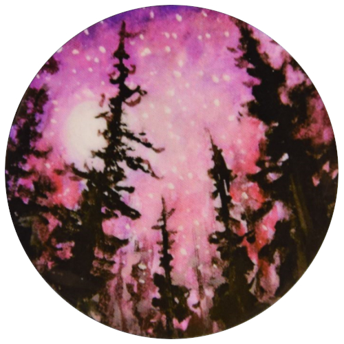 Maalauksista käsinvalmistetut pyöreät magneettikoristeet vaikkapa jääkaapinoveen. Magneetti on pieni ja kevyt puukiekko (halkaisija 4cm ja paino 5g), jonka taakse on liimattu magneettinauhaa. Kaikki magneetit on pintakäsitelty akryylilakalla. Kuvassa on alun perin vesiväreillä toteutettu työ. Hämyinen vaaleanpunaisen ja violetin sävyttämä taivas täynnä pieniä valkoisia tähtiä. Kirkas valkoinen kuunvalo loistaa yläviistosta vasemmalta. Taka- ja etualallla on kuusimetsää siluettimaisesti mustalla. Puut ovat eri korkuisia, taipuen reunoilta vähän sisäänpäin, tuoden näkökulman, jossa katsoja olisi alhaalla maassa. Seassa on myös hieman usvaa, tuoden tunnelmaan mystisyyttä.