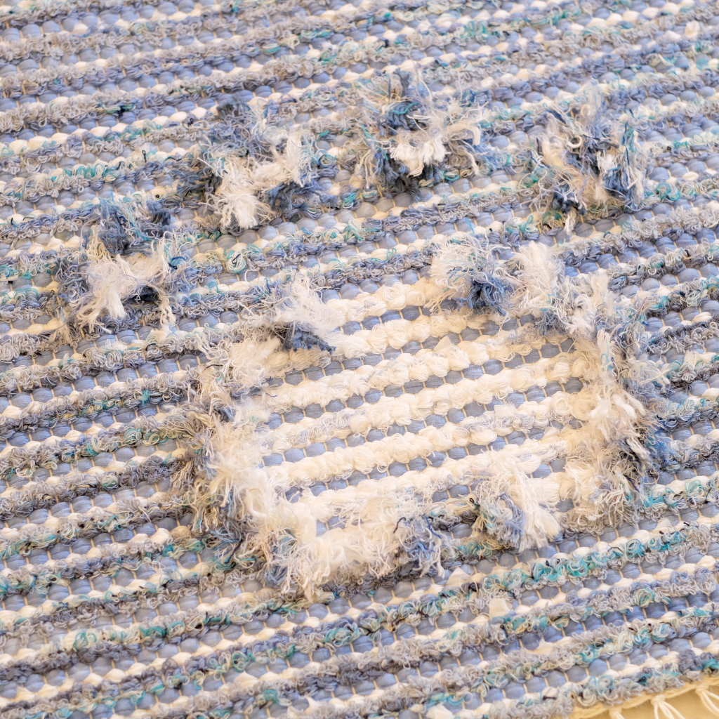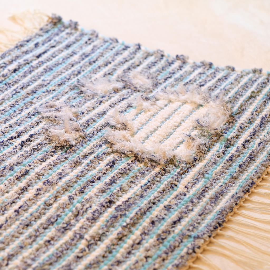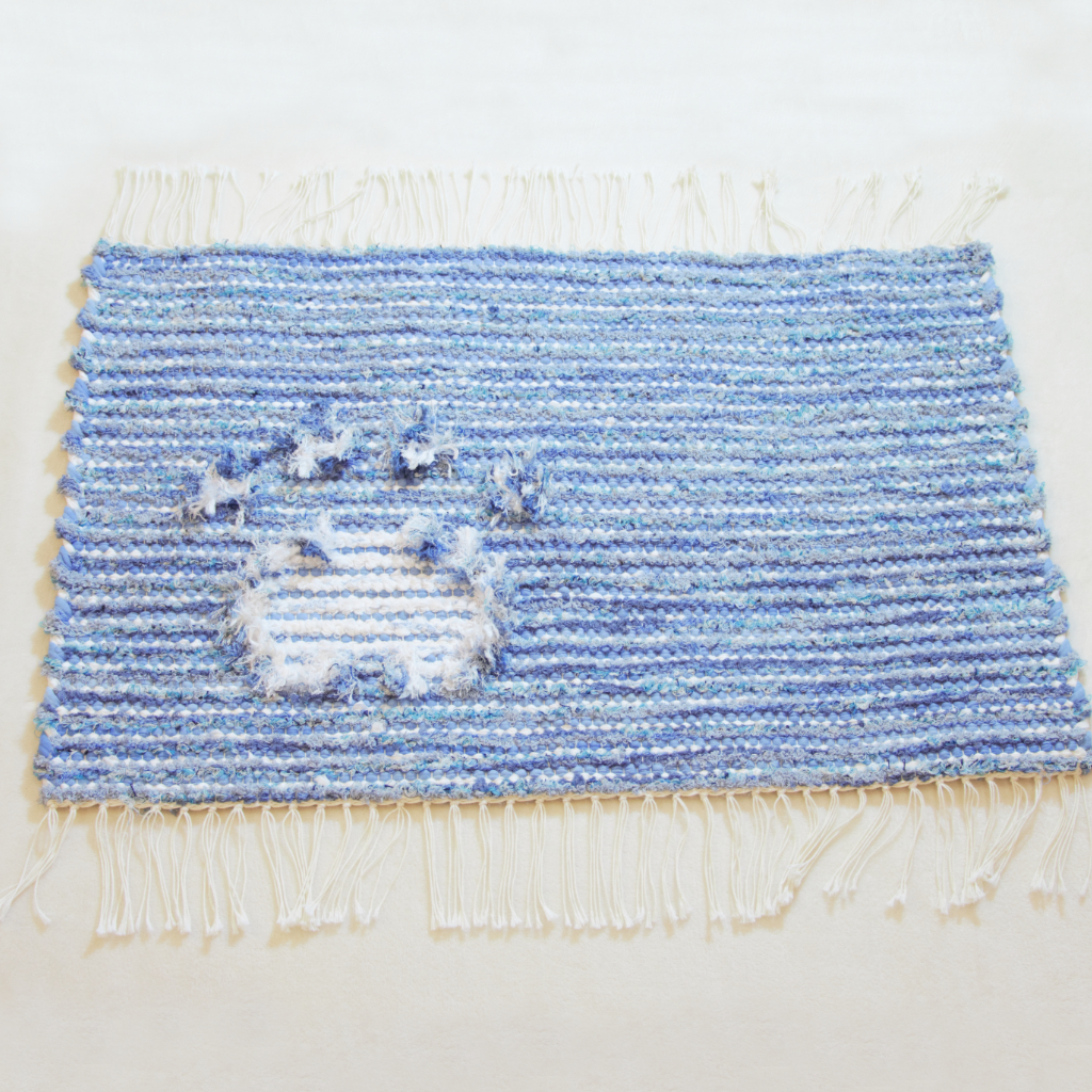 Sinisävyinen matto on pääosin kudottu kolmella eri kuteella. Yksi on vaaleansininen trikoo, toinen valkoinen palttinakude ja kolmas sinertävä pörrökude. Maton vasempaan laitaan on kudottu yksi Ruokolahden leijonan tassunjälki, joka korostuu matosta vaaleampana. Tassunjälki tulee myös pehmeästi koholle matosta. Pesuohjeena mattoa voi liottaa kädenlämpöisessä miedossa pesuainevedessä ja tarvittaessa harjata pehmeällä harjalla. Huuhtele matto lopuksi puhtaalla vedellä, jotta pesuaine poistuu.