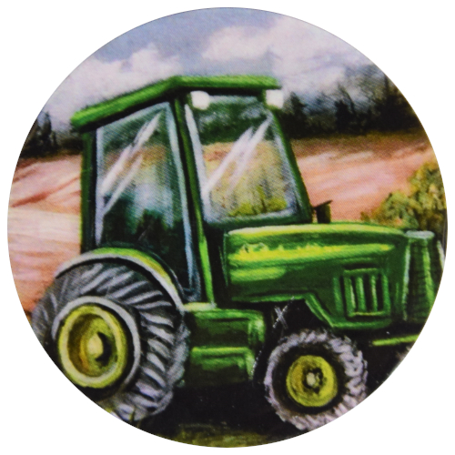 Pyöreä magneetti, jossa piirrosmaisesti maalattu traktori peltomaiseman edessä.