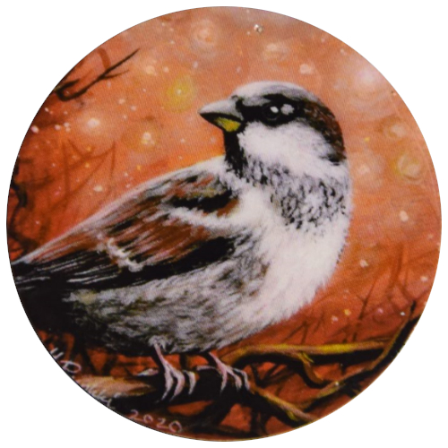 Maalauksista käsinvalmistetut pyöreät magneettikoristeet vaikkapa jääkaapinoveen. Magneetti on pieni ja kevyt puukiekko (halkaisija 4cm ja paino 5g), jonka taakse on liimattu magneettinauhaa. Kaikki magneetit on pintakäsitelty akryylilakalla. Kuvassa on pikkuinen lintu, varpunen. Lintu on väritykseltään ruskeanvalko-kirjava. Poskessa valkoista aina mahaan saakka, ja päälaki tumma. Siivet ovat lähes kokonaan ruskeat, muutamia valkoisia raitoja lukuun ottamatta. Varpunen istuu puunoksalla, katsoen tarkkaavaisesti vasemmalle. Tausta on hempeän oranssi, valkoisten utuisten pallojen kera, jotka muistuttavat hieman kevyttä lumisadetta tai tähtiä.