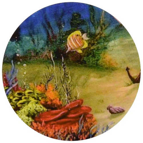 Pyöreä magneetti, jossa värikäs vedenalainen maailma.
