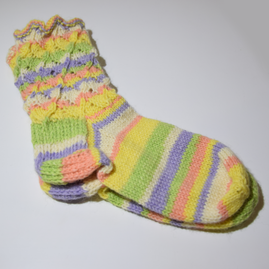 Sukissa on viittä eri väriä; vihreä, keltainen, lila, vaalean punainen ja luonnon valkoinen. Kaikki värit ovat hempeitä pastellisävyjä. Sukat ovat raidalliset. Raitojen leveys vaihtelee noin 0,4 – 2 cm välillä. Sukkien varret on neulottu aaltoilevalla pitsikuviolla.